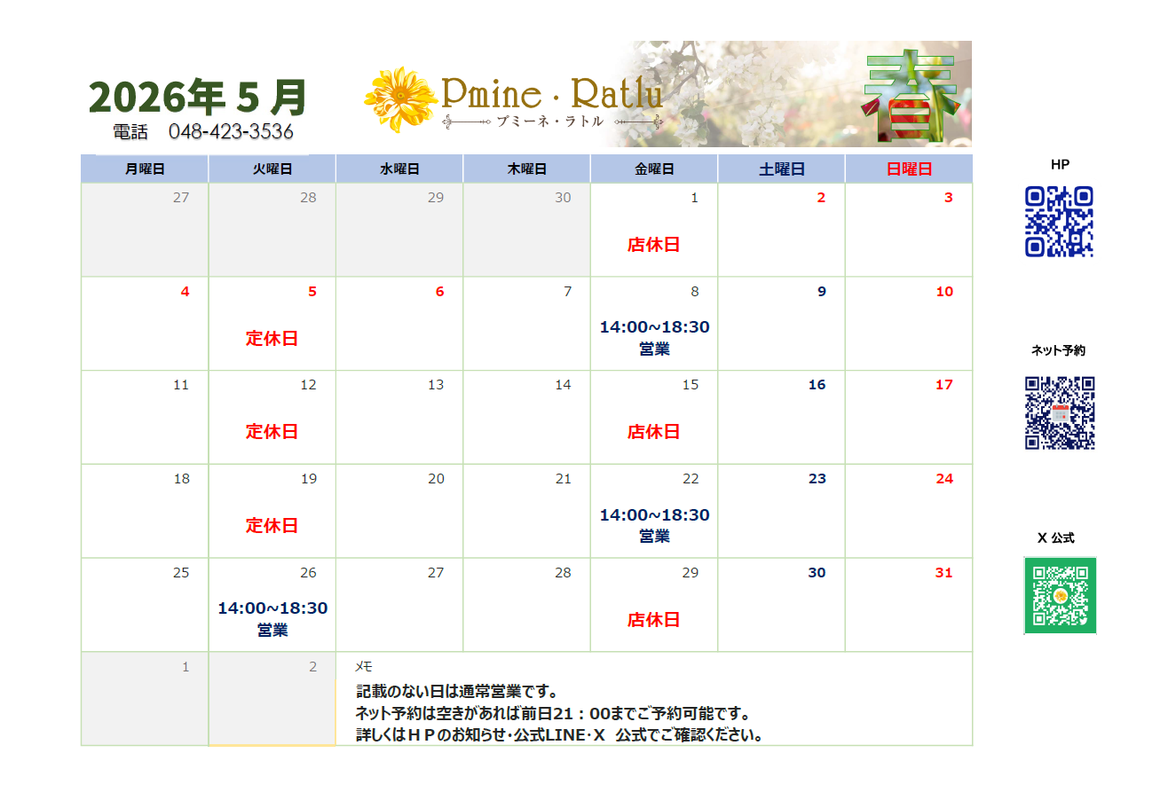 | 店舗休業日 | 毎週火曜日(特別営業日あり) 毎週金曜日(特別営業日あり) 別途店休日は HPトップページの営業日カレンダー Google店舗情報 Yahoo店舗情報 LINE公式 PayPayストア情報 X公式などにてご確認ください。 |