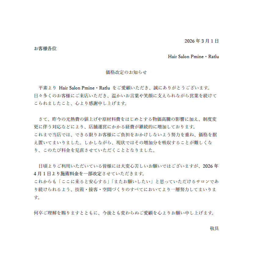 いつもHair Salon Pmine・Ratluをご利用いただきありがとうございます。
