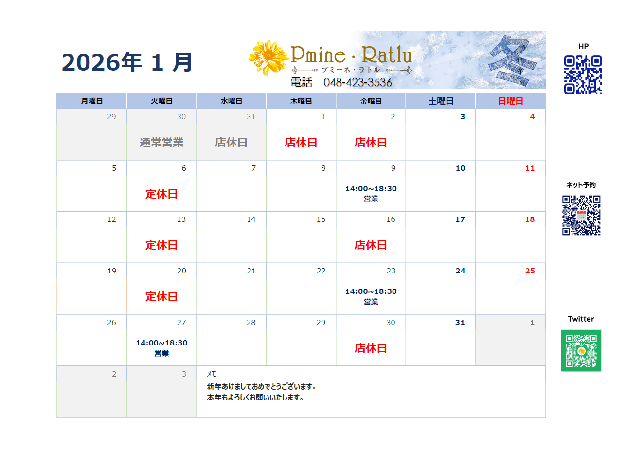 新年1月の営業カレンダーができました。本日より1月のネット予約が可能です。